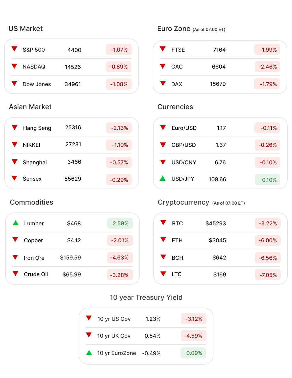 S&P 500 (-1.07%▼) lost more than 47 points to close at 4400. Dow Jones (-1.08%▼) slid by a little less than 400 points, while Nasdaq (-0.93%▼) lost 130 points.
