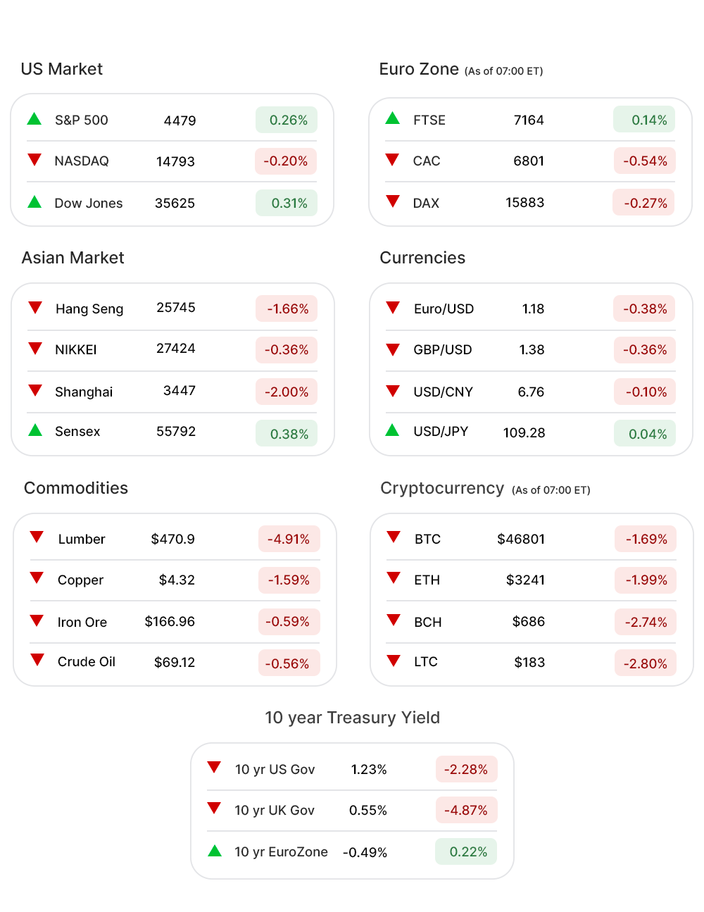 Shanghai fell by around 2% amid fresh tech-sector regulations in China, weak economic data from the mainland, and the spread of delta variant. Hang Seng fell by more than 430 points and Nikkei slid 0.36%.