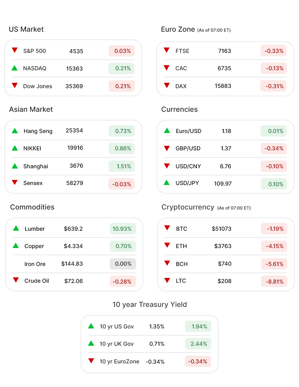 As of 07:00 ET, all the indices were red, barring Dow Futures (0.10%▲). Nasdaq Futures (-0.02%▼), and S&P 500 Futures (0.06%▲).