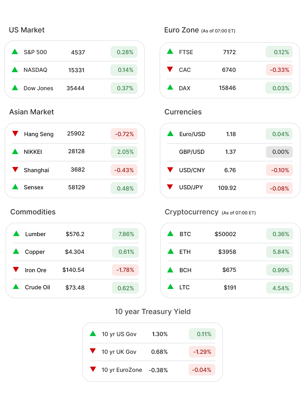 As of 07:00 ET, all the indices were green, without an exception: Dow Futures (0.18%▲), Nasdaq Futures (0.12%▲), and S&P 500 Futures (0.18%▲).