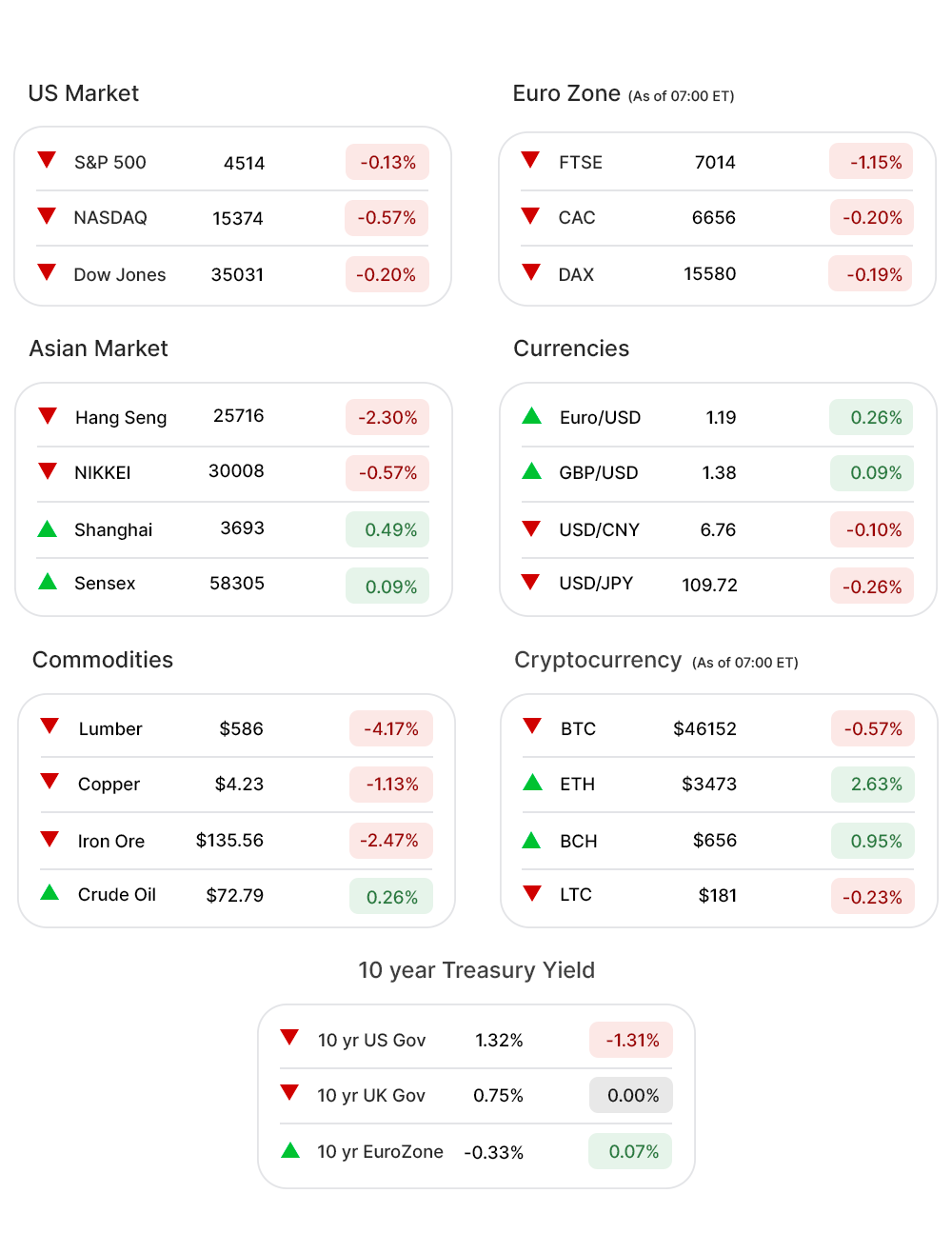 As of 07:00 ET, all the indices were in red, without an exception: Dow Futures (-0.19%▼), Nasdaq Futures (-0.18%▼), S&P 500 Futures (-0.22%▼), and Russel 2000 Futures (-0.43%▼).