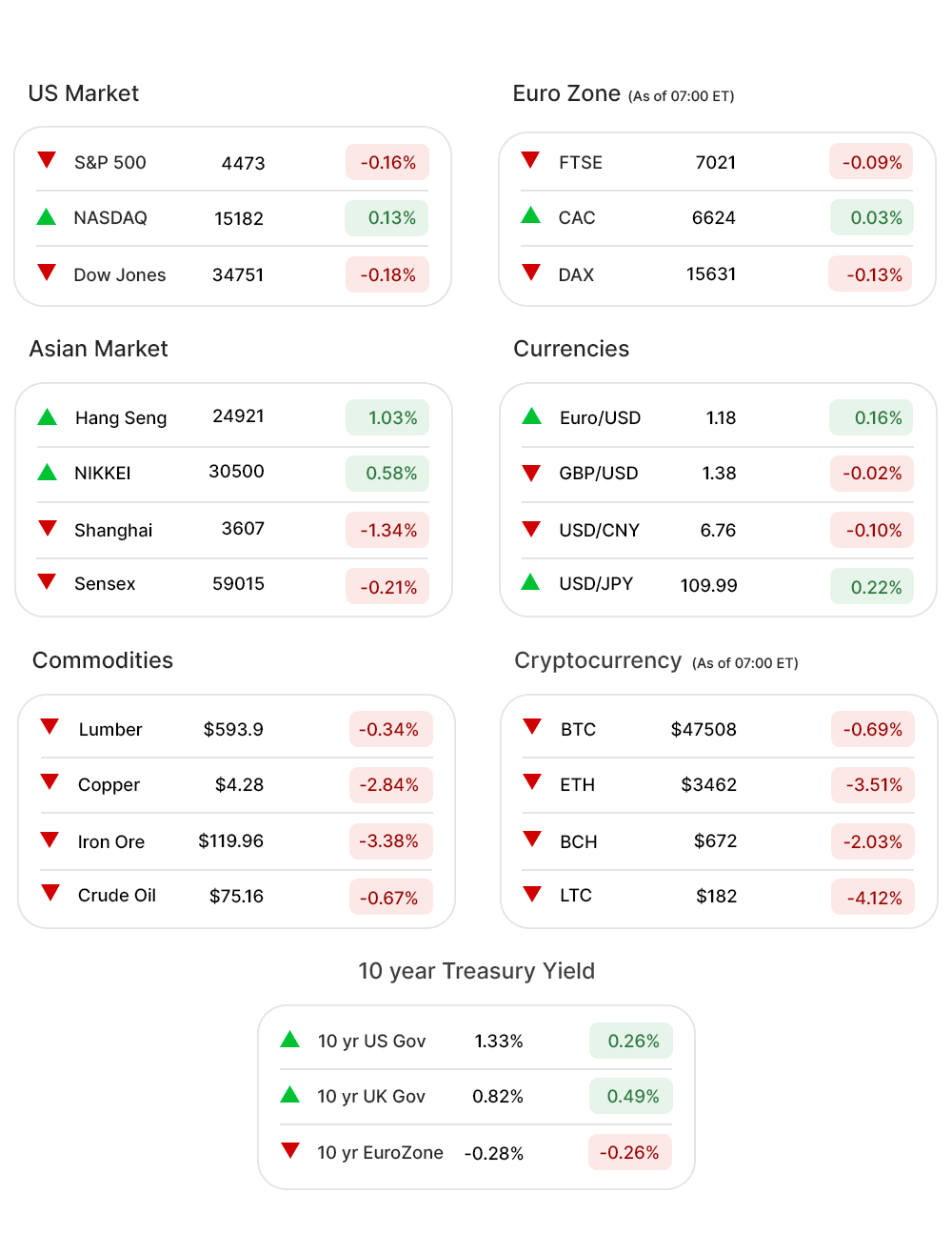 As of 07:00 ET, none of the indices was in green. Nasdaq Futures (-0.20%▼), Dow Futures (-0.18%▼), S&P 500 Futures (-0.23%▼), and Russel 2000 Futures (-0.27%▼).