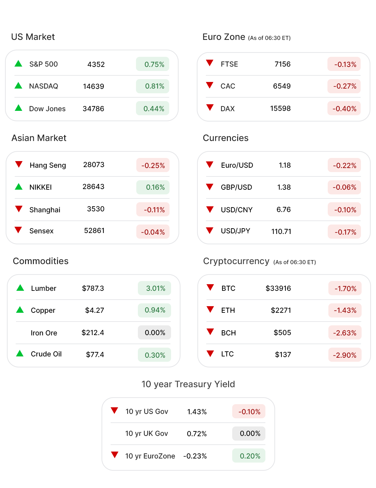 As of 07:30 ET, the US Index futures, barring Russell 2000 Futures (-0.05%▼), were all green. S&P Futures (0.08%▲), Nasdaq Futures (0.22%▲), and Dow Futures (0.04%▲)