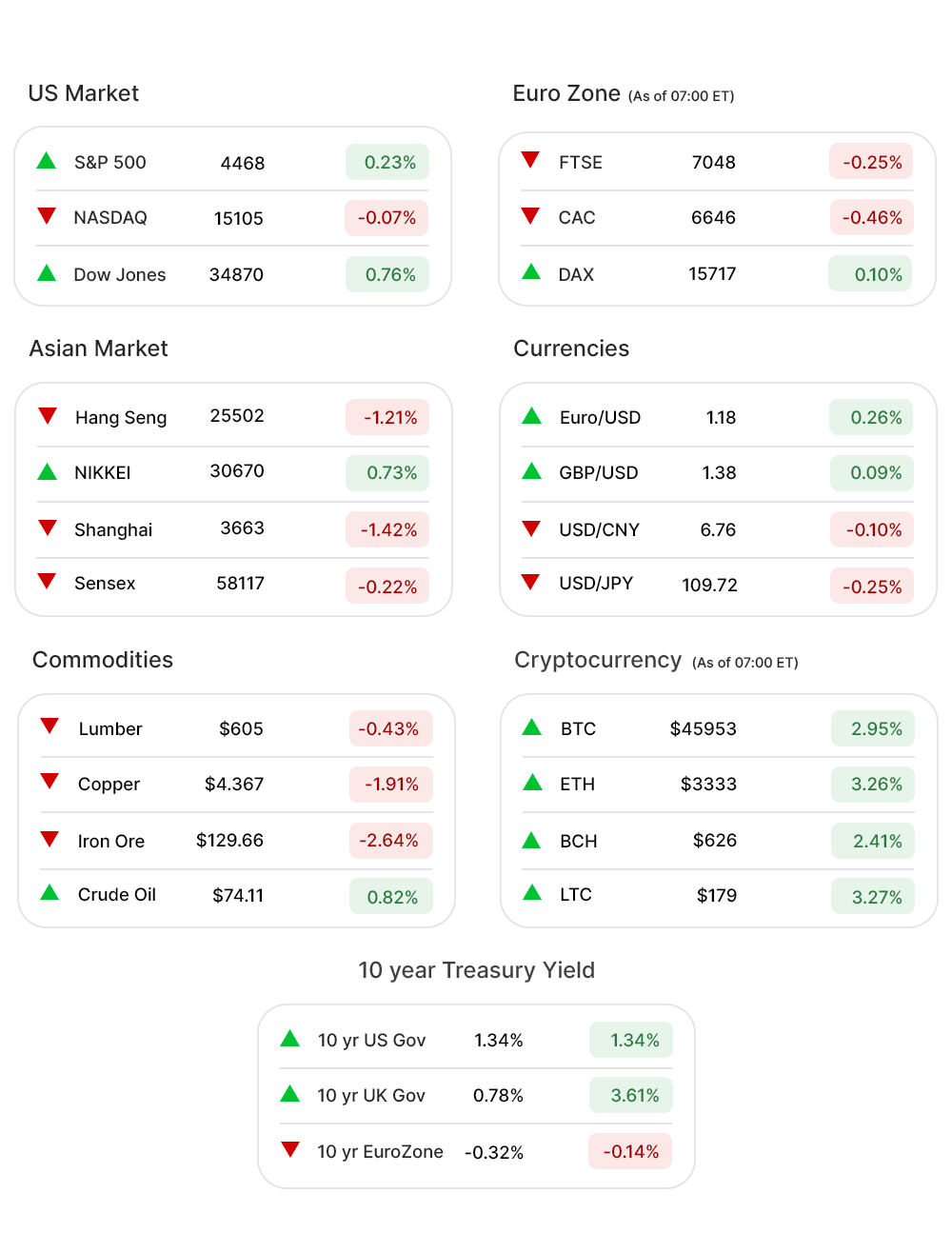 S&P 500 (0.23%▲) added a little more than 10 points, by the close, after fluctuating between red and green through the day. Dow Jones (0.76%▲) gained 261 points and closed at 34869.63, while Russel 2000 (0.59%▲) gained over 13 points.