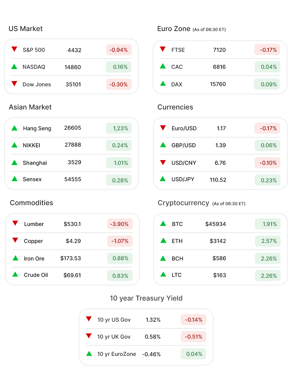 As of 06:30 ET, only Nasdaq Futures (0.11%▲) was in green while S&P 500 Futures (-0.02%▼), Russell 2000 Futures (-0.06%▼), and Dow Futures (-0.07%▼) were all red.