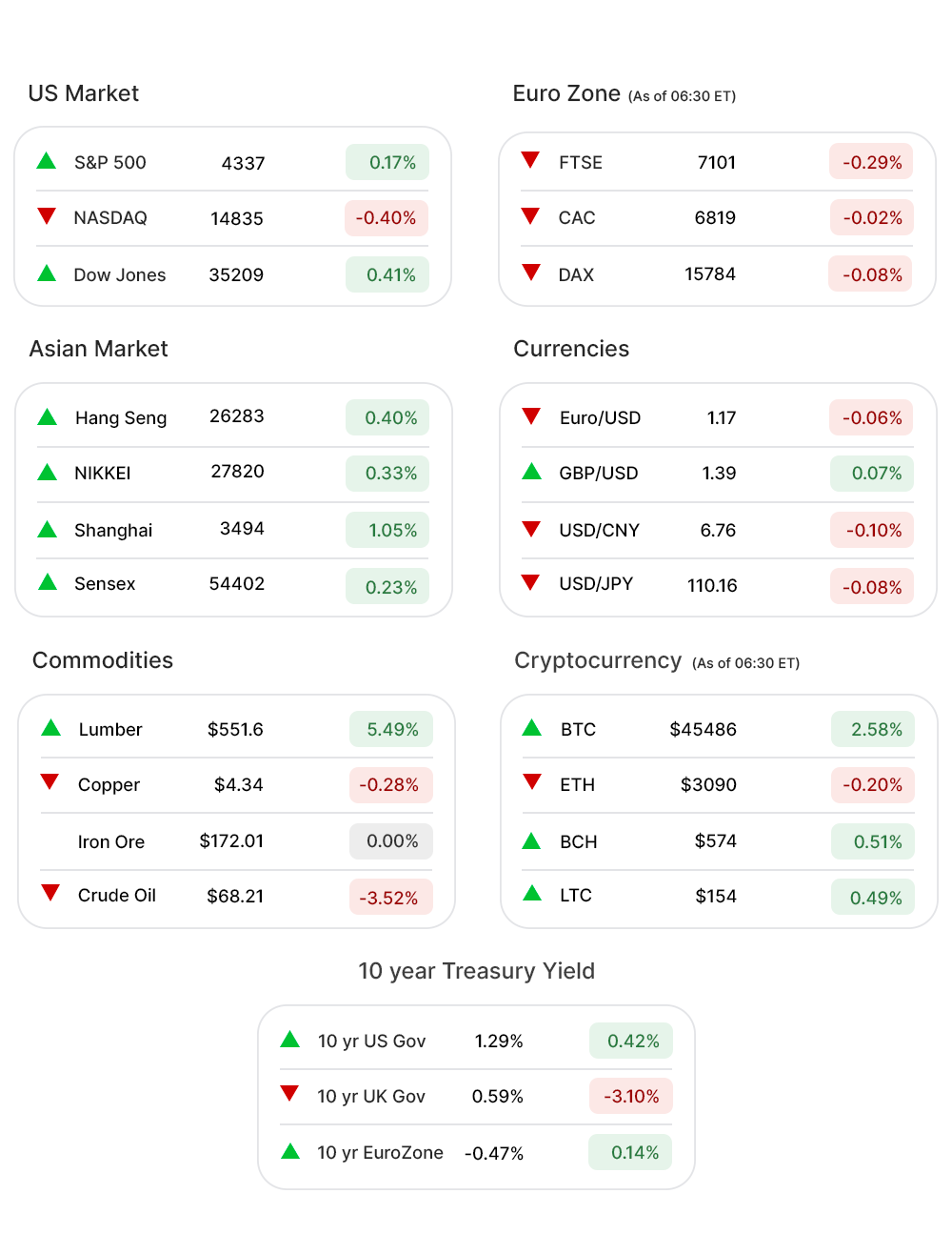 As of 06:00 ET, only Nasdaq Futures (0.06%▲) was in green while S&P 500 Futures (-0.17%▼), Russell 2000 Futures (-0.64%▼), and Dow Futures (-0.29%▼) were all red.