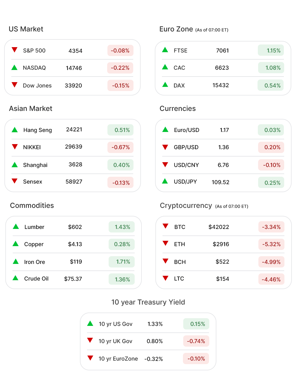 Asian Markets: The markets were mixed as investors await the Fed’s assessment of the US economy, while a looming shadow of the Evergrande crisis continued to make the investors nervous. Tokyo’s Nikkei shed more than 200 points, down 0.67%. Shanghai climbed 0.37%, as Hang Seng also made decent gains of more than 120 points or 0.51%.
