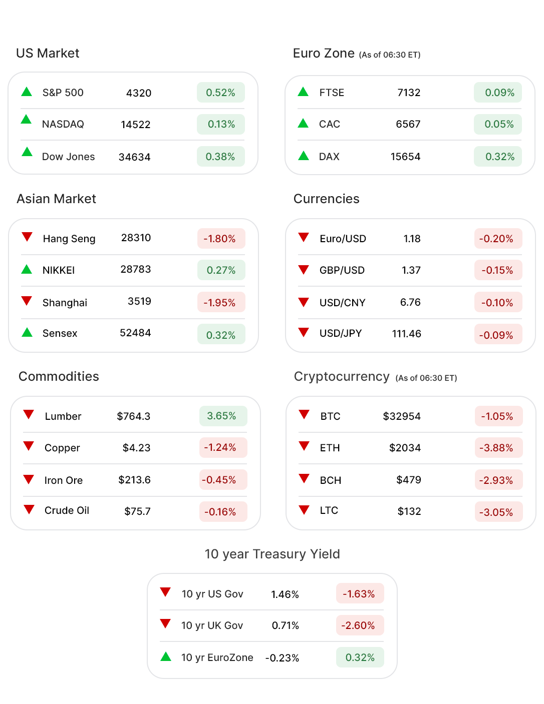 As of 07:30 ET, the US Index futures, barring Russell 2000 Futures (-0.05%▼), were all green. S&P Futures (0.08%▲), Nasdaq Futures (0.22%▲), and Dow Futures (0.04%▲)