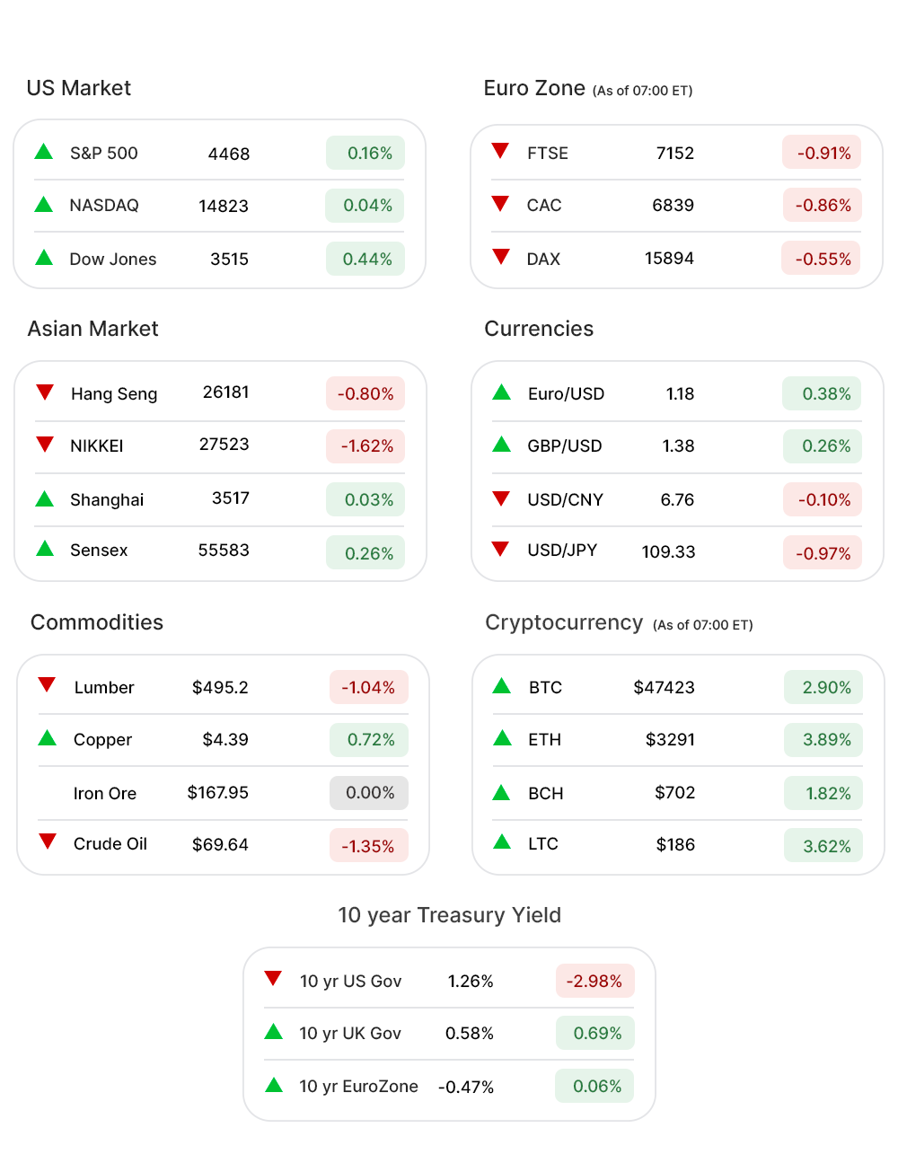 As of 06:00 ET, Futures were red without an exception: Russell 2000 Futures (-0.49%▼), Nasdaq Futures (-0.15%▼), S&P 500 Futures (-0.21%▼), and Dow Futures (-0.22%▼).