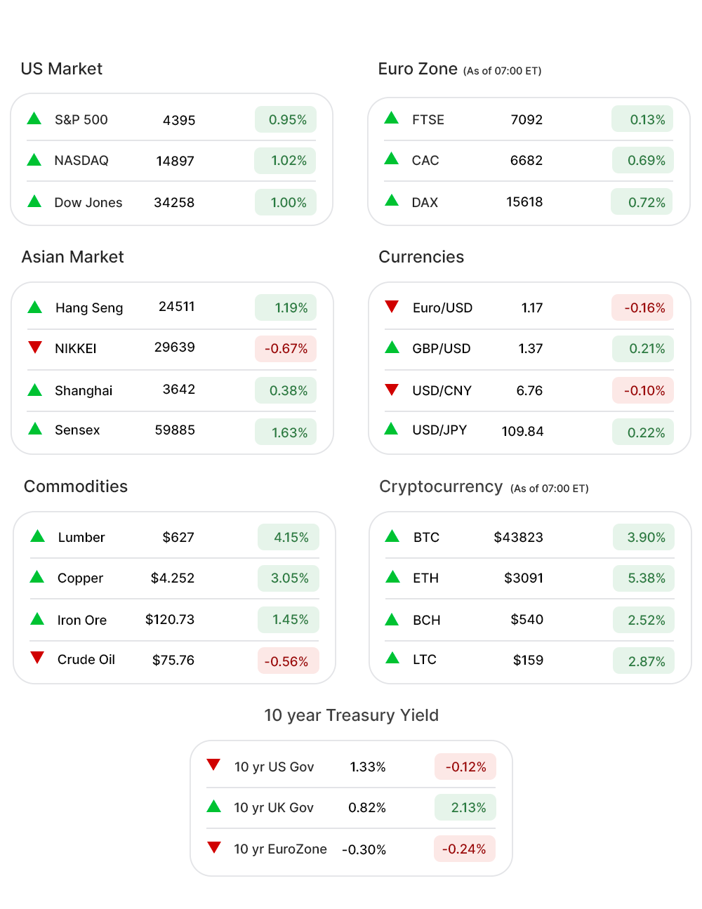 S&P 500 (0.95%▲) gained more than 40 points to end the day at 4395.64. Dow Jones (1.00%▲) notched more than 338 points for the day.