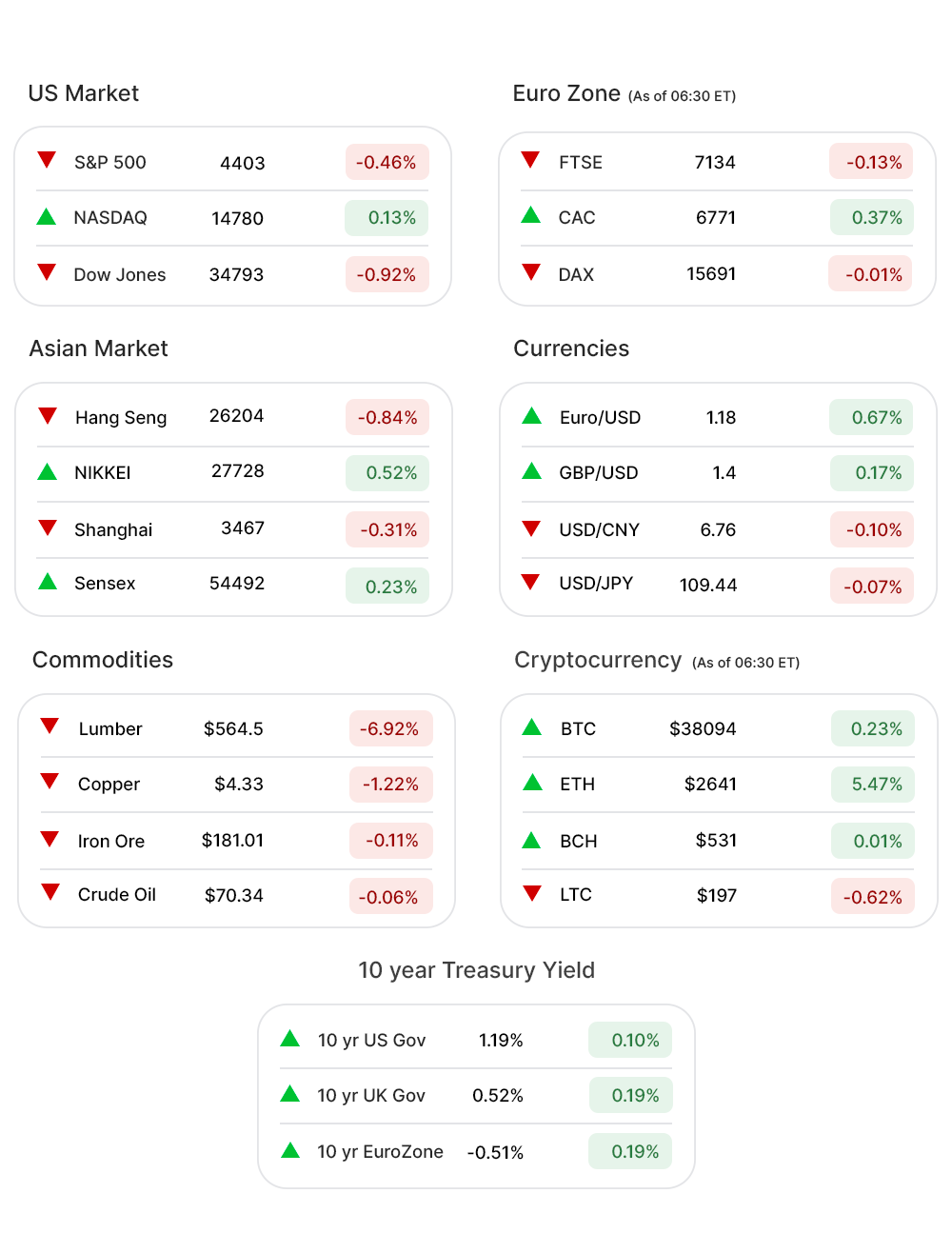 European Markets however advanced as investors looked beyond the delta virus threat and weighed in on better than expected earnings by some major companies of the zone, including Rolls Royce and Siemens.Pan European index Stoxx-600 was up 0.31% early morning. FTSE was however weighed down as investors braced for the Bank of England’s (BoE) monetary policy decision due today.