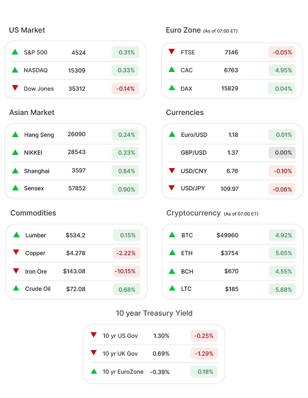 The 10-yr yield was unchanged at 1.30%, and the 2-yr yield increased one basis point to 0.21%. The U.S. Dollar Index decreased 0.1% to 92.52. WTI crude futures increased 0.2%, or $0.11, to $68.55/bbl amid an expected OPEC+ decision to keep production-increases steady at 400,000 bpd.