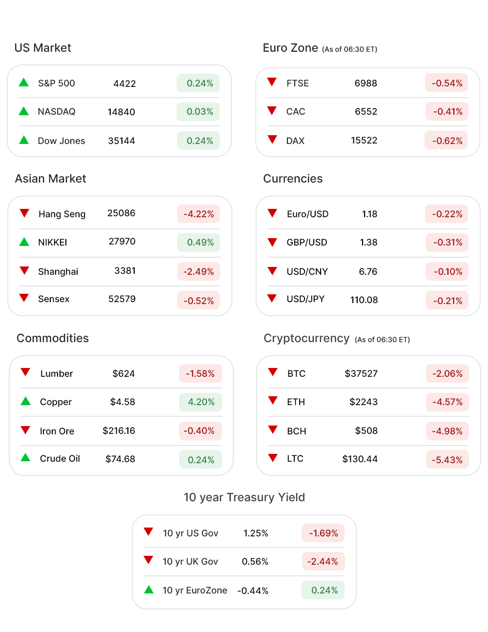 The S&P 500 (0.24%▲) closed at a record 4422. Tech-heavy Nasdaq (0.03%▲) reached 14841 and the Dow (0.24%▲) climbed 82 points to reach 35144.